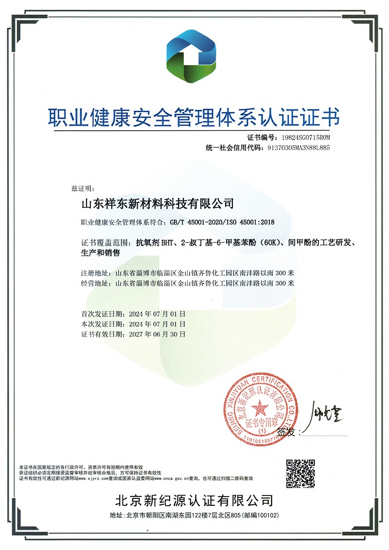 山東祥東新材料科技有限公司1.2萬噸/年6-叔丁基鄰甲(60K)、4-叔丁基鄰甲酚(偏 24 酚)和 4,6-二叔丁基鄰甲酚(偏 246 酚)烷基甲酚項目竣工環(huán)境保護(hù)驗收監(jiān)測報告
